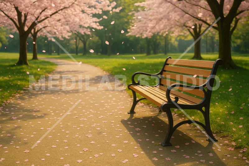公園のベンチに桜の花びらが舞い落ちる様子。春の穏やかな昼間の風景。