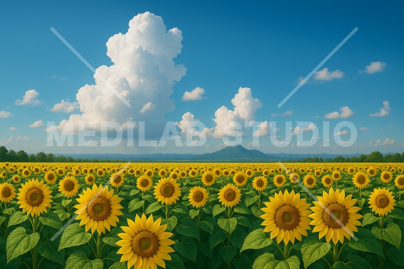 爽快な青空とひまわり畑。よく晴れた空の青と、ひまわりの黄色がマッチして元気な雰囲気。