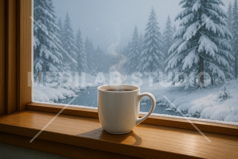 冬の日、暖かい部屋の窓辺にコーヒーを置いた構図。温かいコーヒーとの対比で冬の寒さを感じる構図。