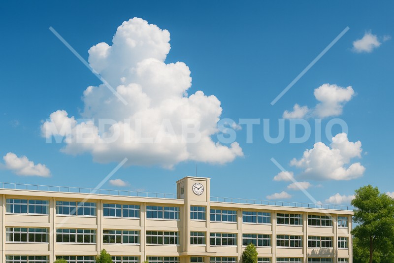 晴れた日の青空と学校の校舎の様子。入道雲がもくもくと浮かんでいる夏の構図。