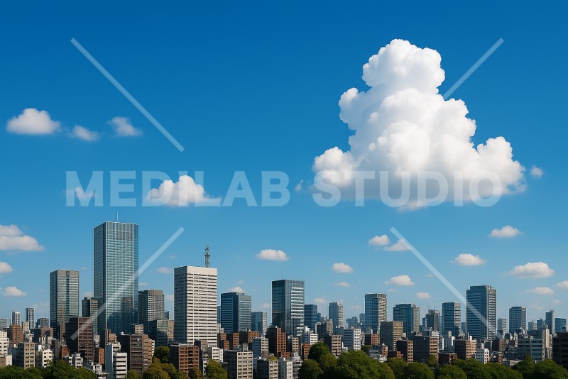 都会のビル街。晴れた日の青空とビルが映える構図。すっきりとした晴れの日。