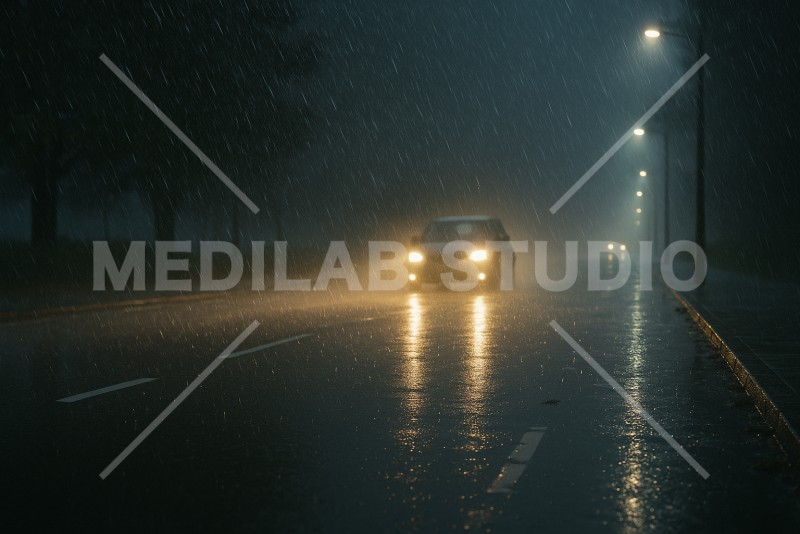 雨の日の夜、ヘッドライトで前方を照らして走る車の様子。暗い夜の雰囲気。