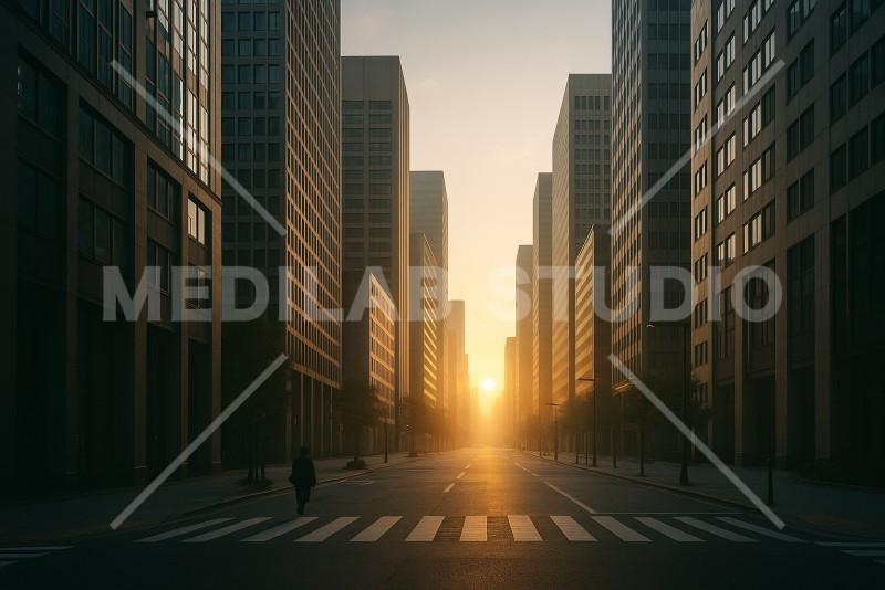 都会のオフィス街が朝を迎える様子。朝日が差し込む瞬間。