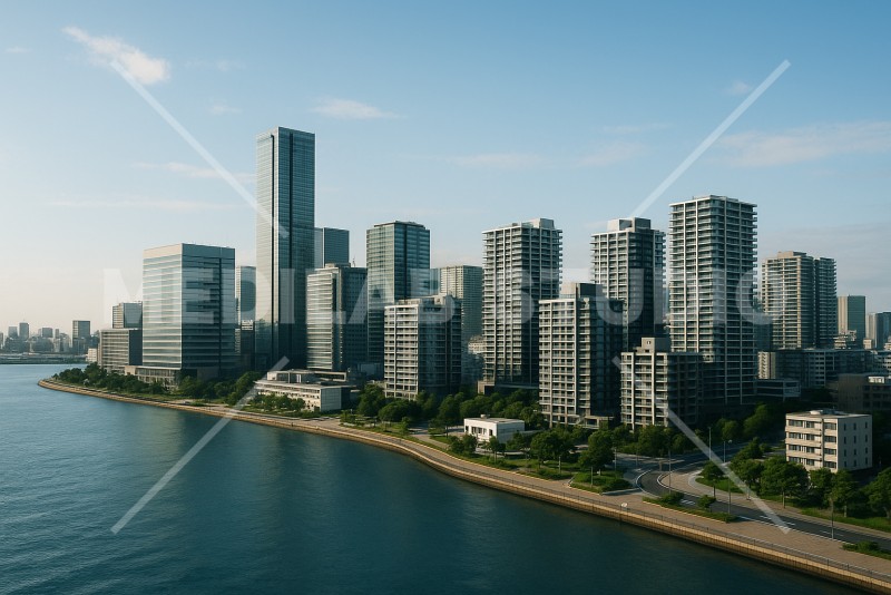大きな川の近くにあるリバーサイドの街。ビルが建ち並んでいて都会のイメージ。