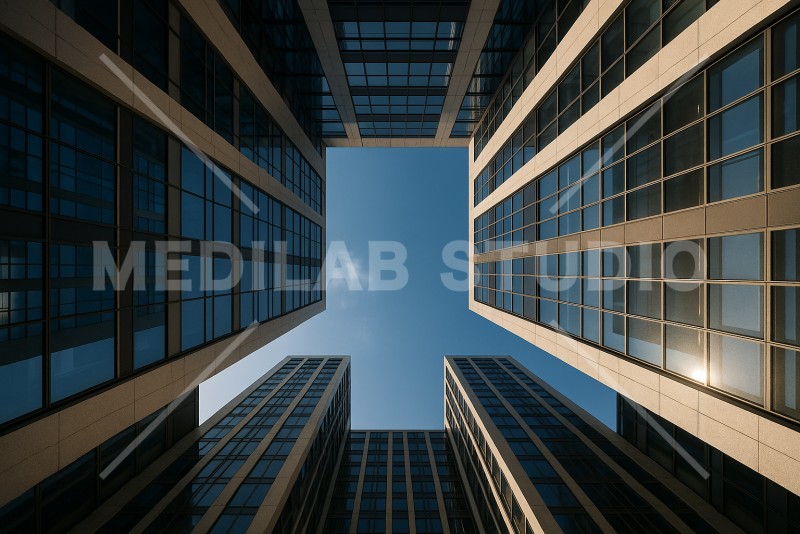 近代的なビルを下から見上げる構図。青空とビルが映えてスタイリッシュな構図。