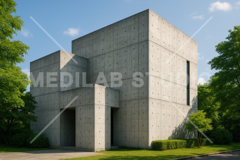 コンクリート打ちの近代的な建築。シンプルでありつつ洗練されたデザイン。
