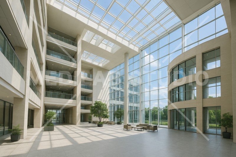 大きなガラス屋根が特徴的な建物内観。ミュージアムなどの公共施設をイメージ。