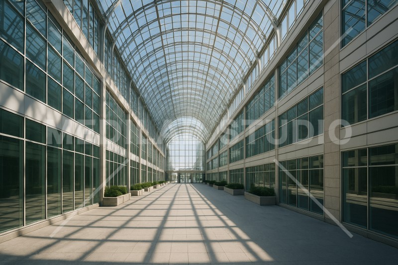 大きなアーチ屋根が特徴的な、全天候型ショッピングモール。スタイリッシュなイメージ。
