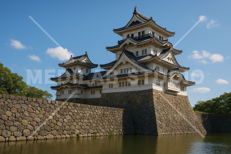 青空の下に建つ、日本の歴史的なお城をイメージ。堂々とした構図。
