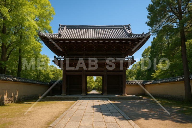 日本の伝統的な寺院の入り口をイメージ。大きな屋根と周囲の樹木が特徴。厳かな印象。