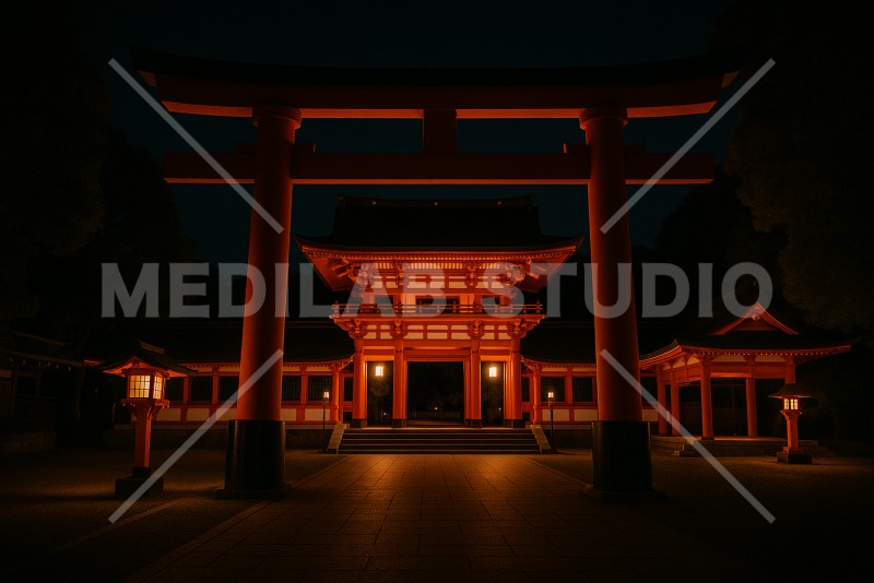 日本の伝統的な神社が夜間にライトアップされている様子。神聖な印象。