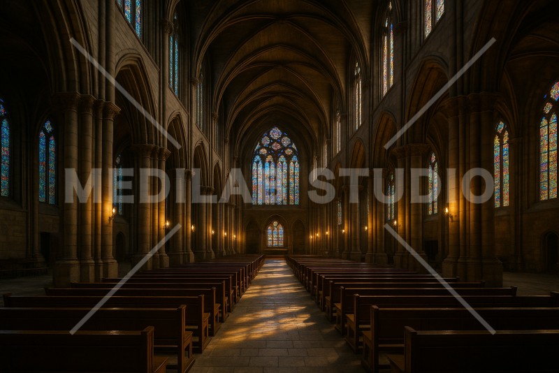 ヨーロッパの伝統的な教会。夜間少ないライトに照らされた神聖なイメージの構図。