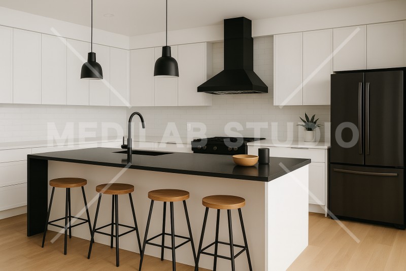 モノクロトーンでまとめたキッチン。カフェ風の椅子が並び、洗練された印象があるカウンター。