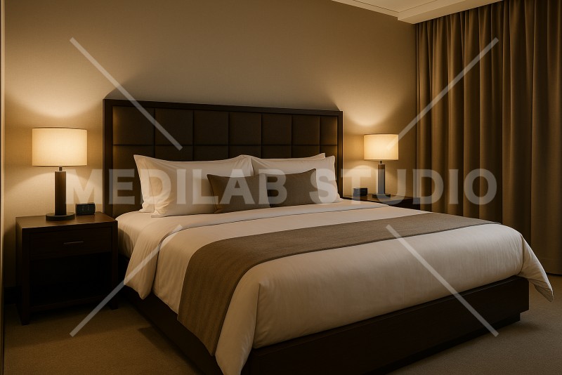 白とグレーを基調としたベッドと間接照明で落ち着いた印象の寝室インテリア。
