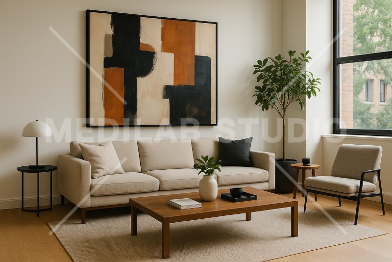 モダンなアートが飾られたリビングの風景。シンプルな家具がアートを引き立てている。