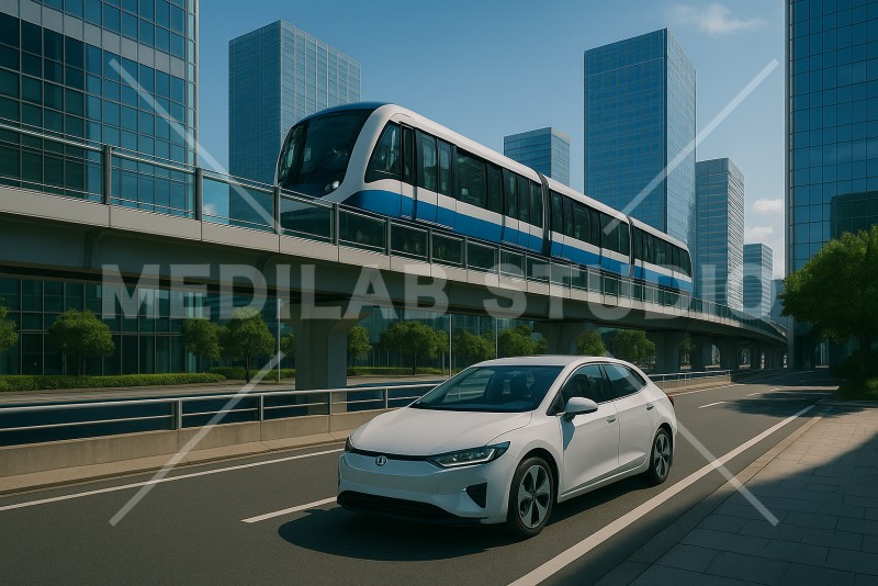 モノレールと電車が並走している様子。交通機関が充実している都会の街をイメージ。