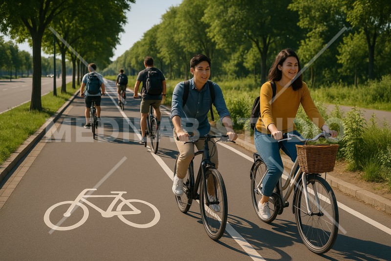 サイクリングロードを自転車に乗って人たちが行き交っている様子。晴れた日の爽快な光景。