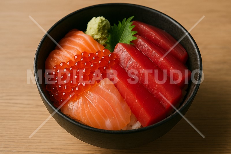 マグロ・サーモン・いくらなどが乗った海鮮丼。ネタの新鮮さが際立つ構図。
