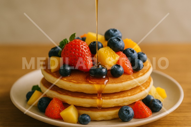 フルーツたっぷりのパンケーキにメイプルシロップをかける瞬間。ふっくらしたケーキとシロップが魅力的。