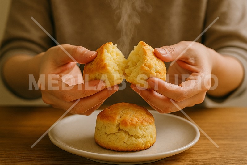 ふっくらと焼けたスコーンを手で割っている様子。焼き加減がよく食欲をそそる構図に。