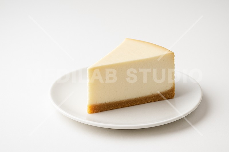 白背景、白いお皿でシンプルな構図のレアチーズケーキ。洗練されたイメージ。