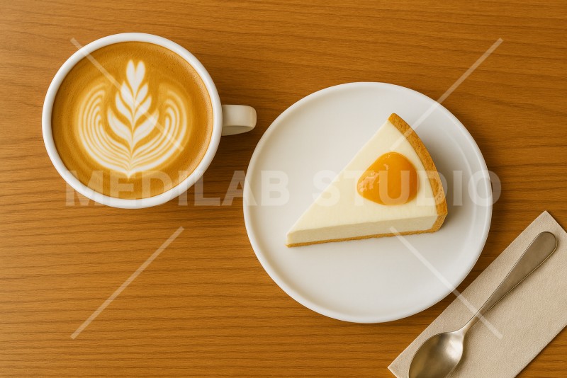 柑橘系ソースをのせたレアチーズケーキと、ラテアートがほどこされたカフェラテ。特別なティータイムのイメージ。