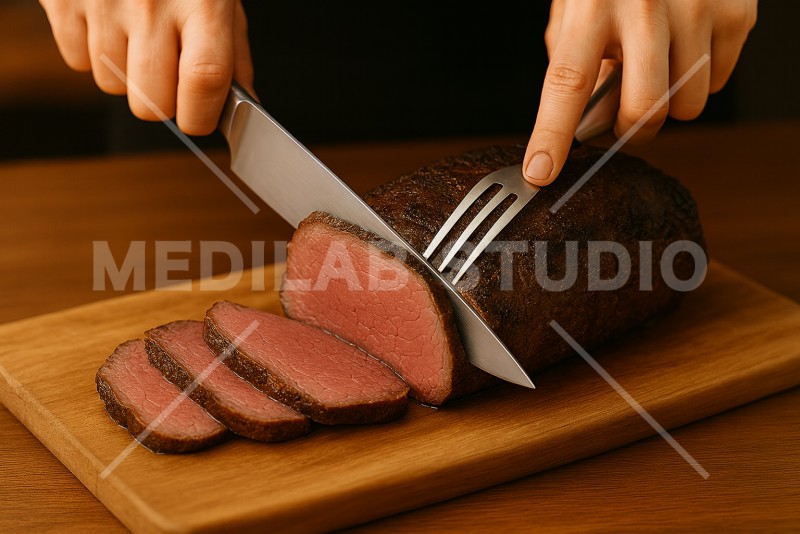 ローストビーフを薄く切り分ける様子。新鮮で絶妙な火の通り方をした断面がポイント。