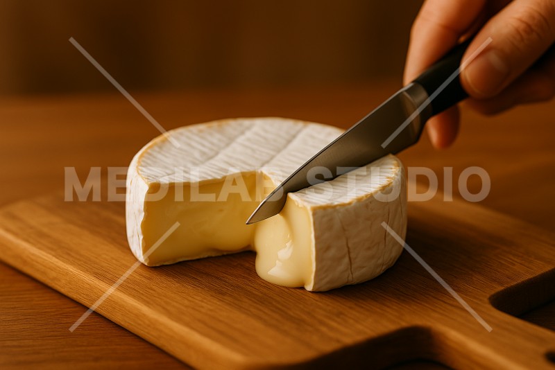 ねっとりとしたカマンベールチーズをナイフで切り分ける様子。チーズがあふれでる美味しそうな瞬間を切り取る。