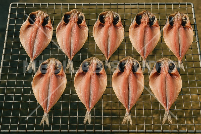 アジの干物を網に乗せて干している様子。たくさんのアジを一気に干物に加工している光景。