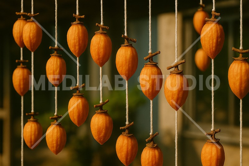 柿を干して干し柿にしている様子。たくさんの柿が紐につるされている。