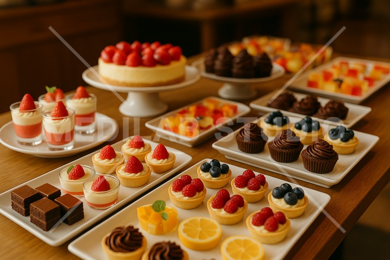 スイーツのバイキングができるレストランのケーキコーナーをイメージ。たくさんの種類の小さなケーキが並んで華やかな雰囲気。