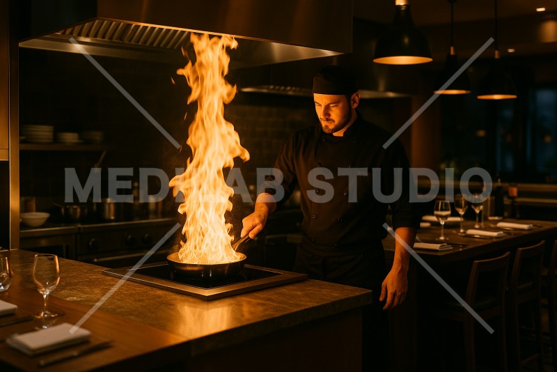 レストランでシェフがフランベをしている様子。火が一気に燃える瞬間を切り取って表現。