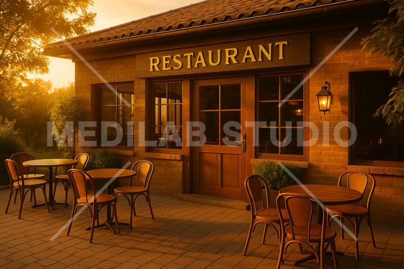 カフェテリア席のある大きなレストランの外観。ブラウン基調の落ち着いた雰囲気。