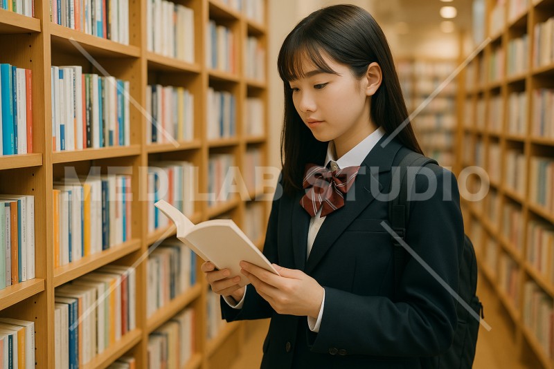 図書館で立ったまま本の内容を見ている女子高生。目当ての本を探しているイメージ。
