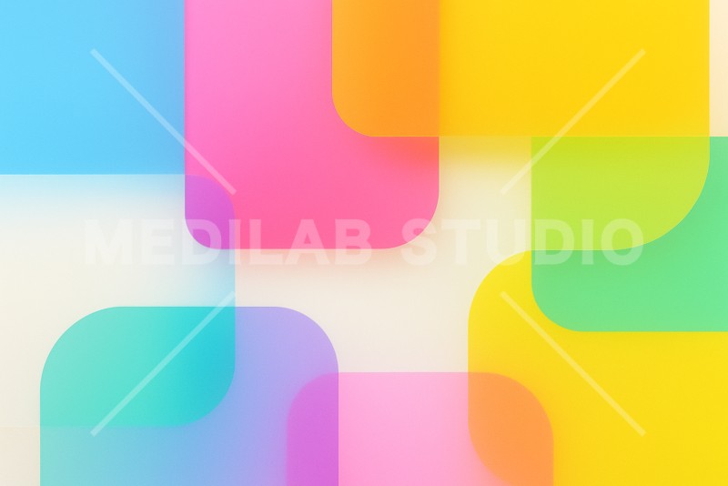 カラフルな角丸正方形が重なるデザイン。フィルムのように透け感があるイメージ。