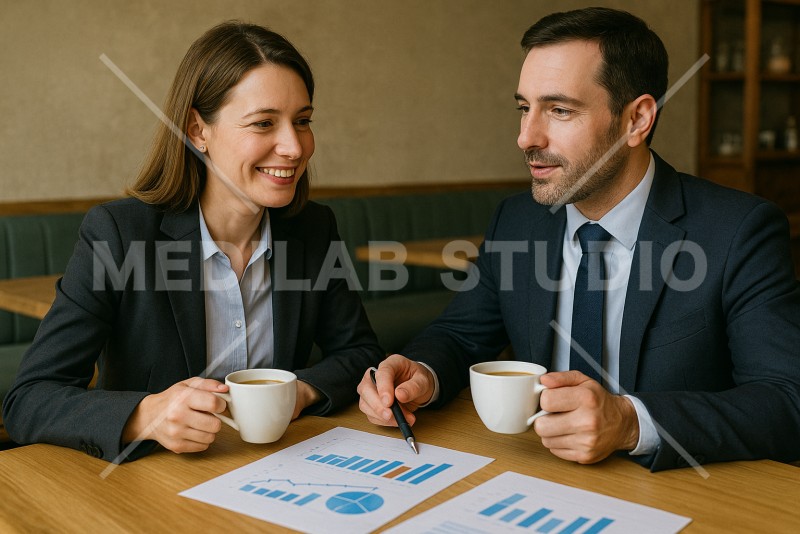 カフェでのミーティングで資料をもとに話す2名の社員。和やかな雰囲気。