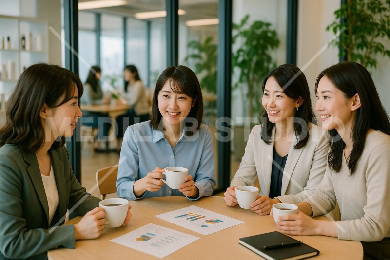女性社員がコーヒータイムを楽しみながらラフなミーティングをする様子。風通しがよい職場をイメージ。